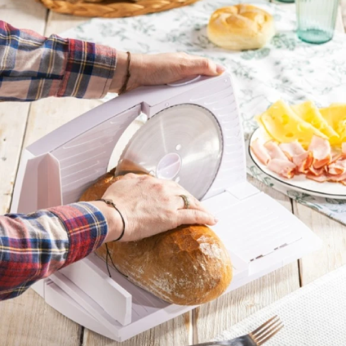 Așezi feliatorul pe blatul de lucru, reglezi grosimea dorită cu ajutorul selectorului, apoi fixezi alimentul cu împingătorul de siguranță. Lama din inox de 170 mm taie ușor atât mezelurile uscate, cât și o felie groasă de pâine de casă, astfel încât obții rapid felii uniforme pentru sandwich-uri, platouri sau micul dejun.