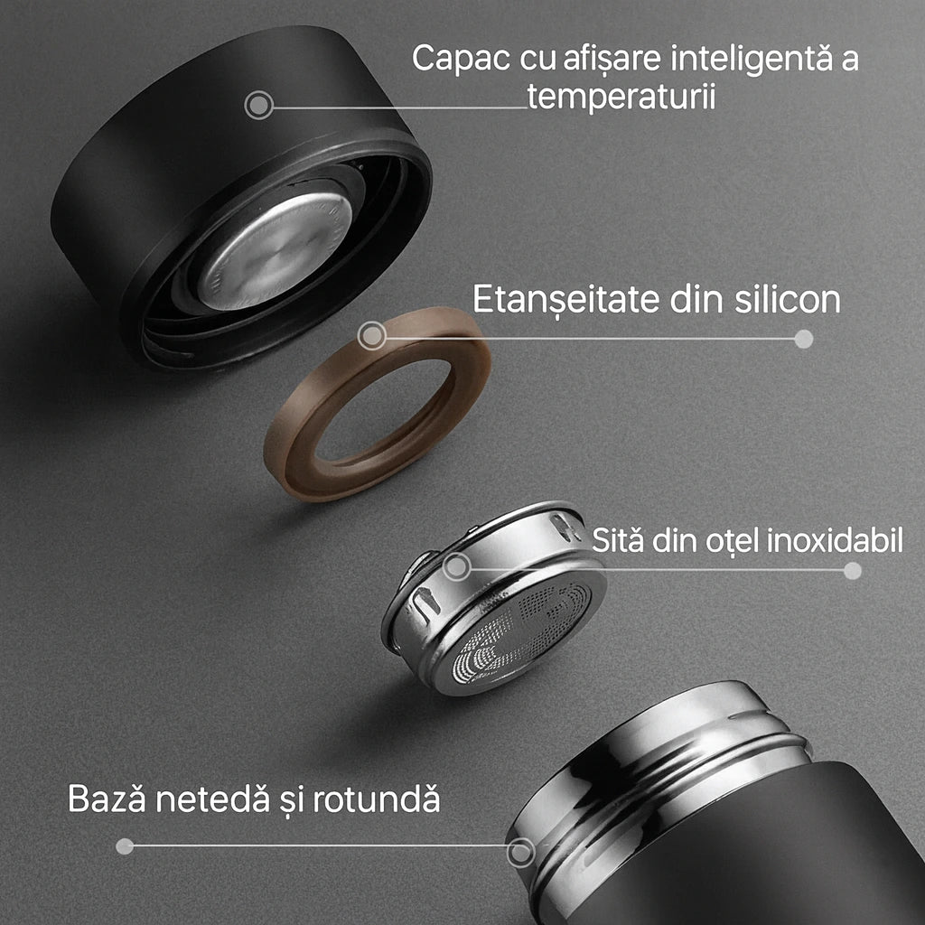 Cu această sticlă termică inteligentă, îți este mai ușor să rămâi hidratat, să îți savurezi băuturile la temperatura ideală și să adaugi un accesoriu elegant și util în rutina ta zilnică.
